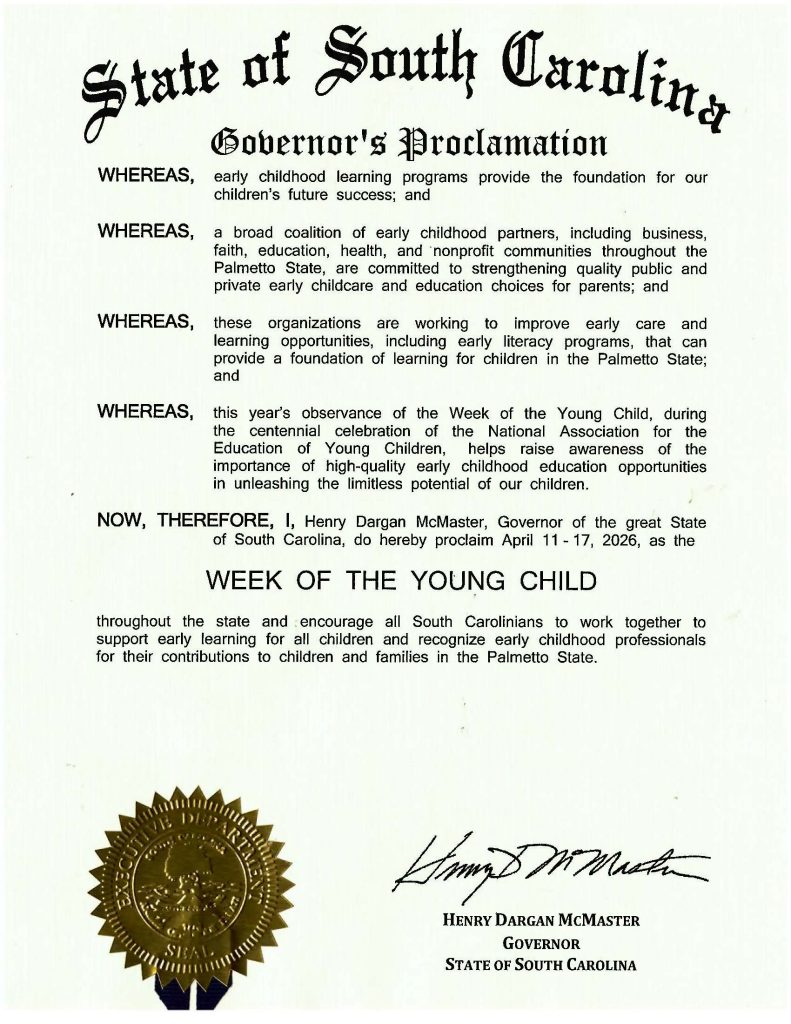 Governor McMaster has issued an official proclamation, pictured below, highlighting NAEYC’s centennial year and declaring April 11-17, 2026 as the Week of the Young Child in South Carolina!